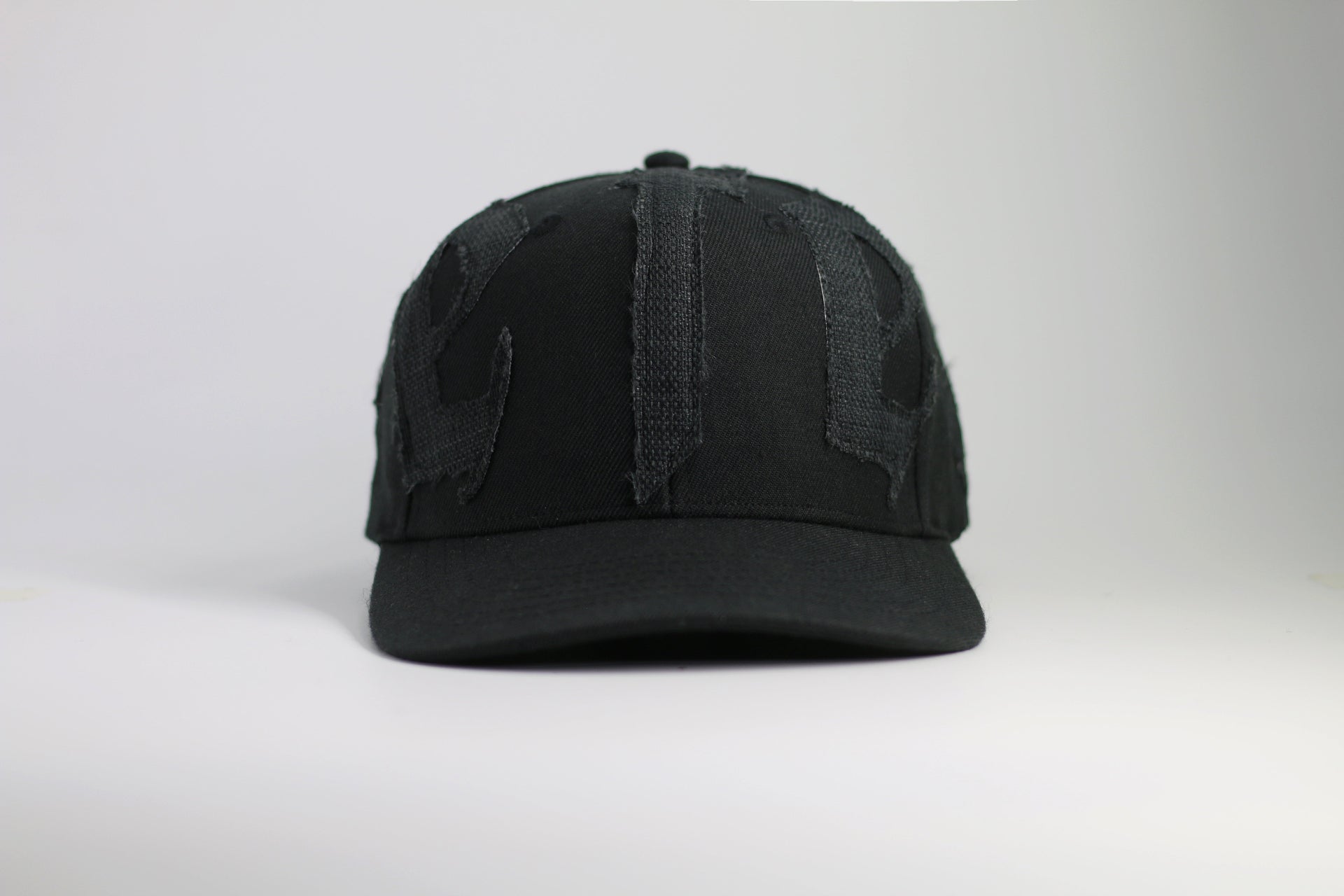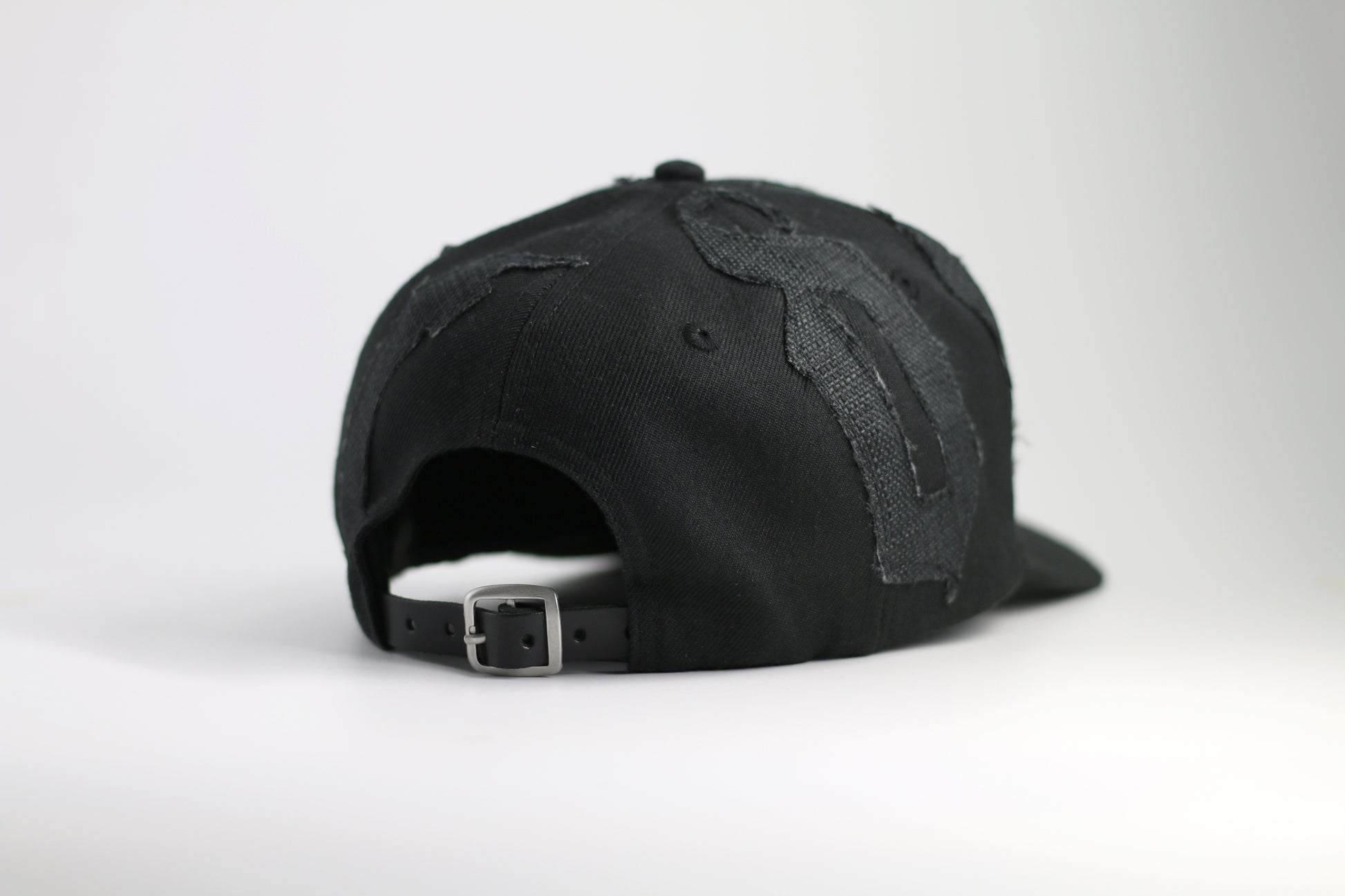 Defect hand sewed black letter by hand cap. Crafted in Stockholm.